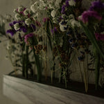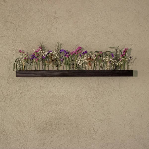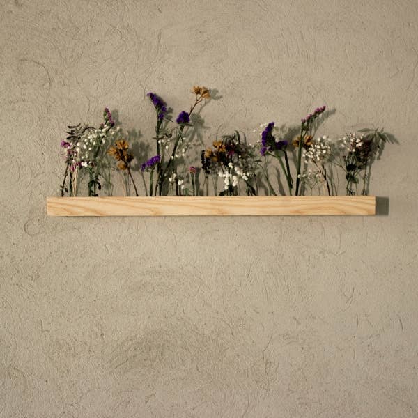 Die Holzleiste, die als markante Wanddekoration dient, bietet eine organische Oberfläche für einzigartige Kompositionen. Die zarten, getrockneten Blumen in den Öffnungen sorgen nicht nur für subtile Eleganz, sondern bringen auch das Element der Natur, fügen sich in das Interieur ein und verleihen ihm eine warme, gemütliche Atmosphäre.